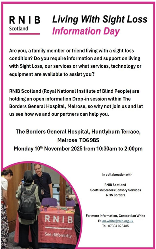 The RNIB ‘Living with Sight Loss’ Information Day at the Borders General Hospital, that was to take place on Monday 10th November, has been CANCELLED.
